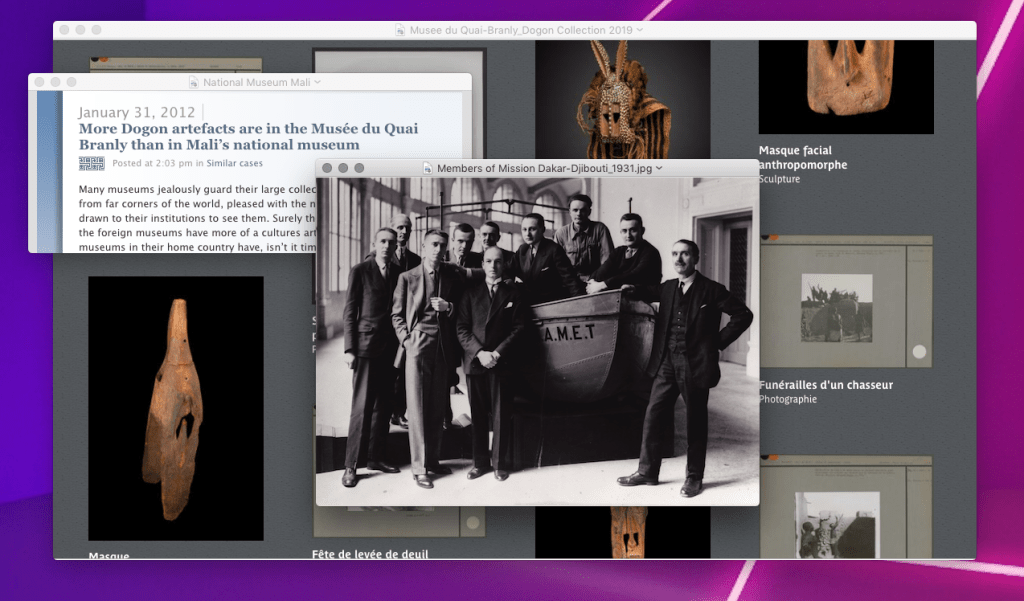 The Dogon masks held in the Musée Quai Branly collection were taken during the notorious Dakar-Djibouti Expedition of 1931 to 1933, in which some 3500 looted/stolen artefacts(including 70 human remains) were brought from Africa to France. It was an “ethnographic and linguistic” expedition comprising of an interdisciplinary team of French scientists under the direction of Marcel Griaule. The expedition team “collected” over 3,500 objects, 6,000 photographs, 1,600 metres of film and 1,500 manuscripts, which were all seized in order to establish the collection of the Musée d’Ethnographie du Trocadéro, the first ethnological museum in Paris, which later became the Musée de l’Homme. This rapacious mission went through the former French colonies taking, looting, stealing and seizing artefacts it thought useful for understanding those countries and their cultures, armed with the authority of a French government decree. The methods used by this expedition were described in detail by the secretary-archivist of the mission, Michel Leiris, in his book, Afrique Fantôme. He wrote that members of the expedition did not shy away from using bribery, intimidation, corruption, blackmail, threats, undue pressure and plain stealing in obtaining objects they desired. The colonial plundering and looting enacted on this expedition caused great destruction to the Dogon area. The Musée de l’Homme’s collections eventually ended up in the Musée Quai Branly.
